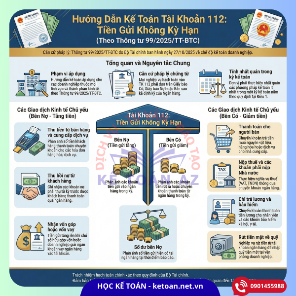 a) Căn cứ để hạch toán trên Tài khoản 112 – Tiền gửi không kỳ hạn là các giấy báo Có, báo Nợ hoặc bản sao kê của ngân hàng, tổ chức khác mà doanh nghiệp được gửi tiền không kỳ hạn theo quy định của pháp luật kèm theo các chứng từ gốc (ủy nhiệm chi, ủy nhiệm thu, séc chuyển khoản, séc bảo chi,…).