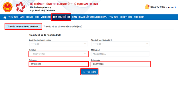 Chọn loại tờ khai 01/GTGT (nếu để trống, hệ thống sẽ liệt kê tất cả các tờ khai đã nộp trong thời điểm tra cứu).