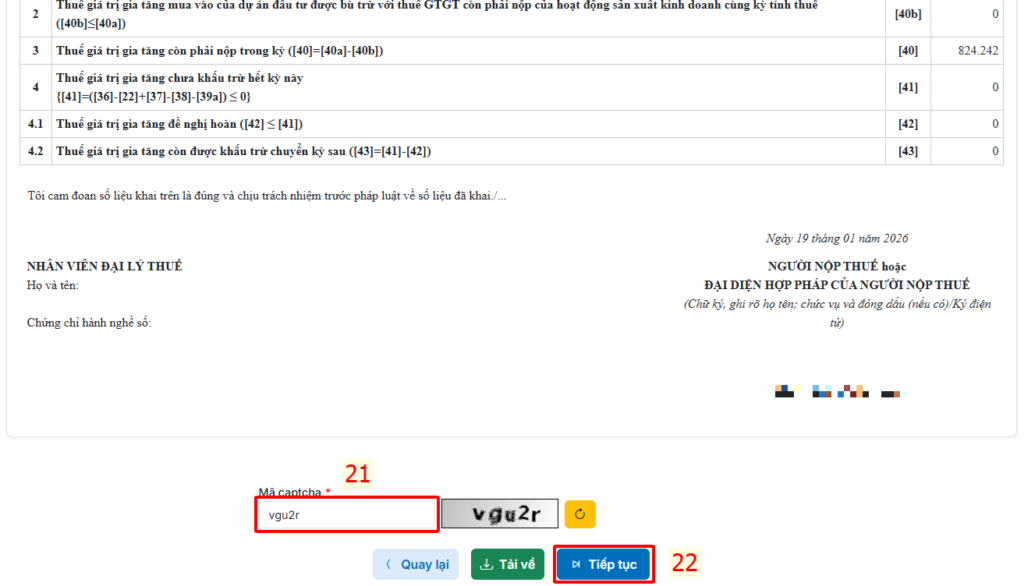 Sau khi kiểm tra tờ khai xong, nhập mã Captcha, chọn Tiếp tục để ký số tờ khai.