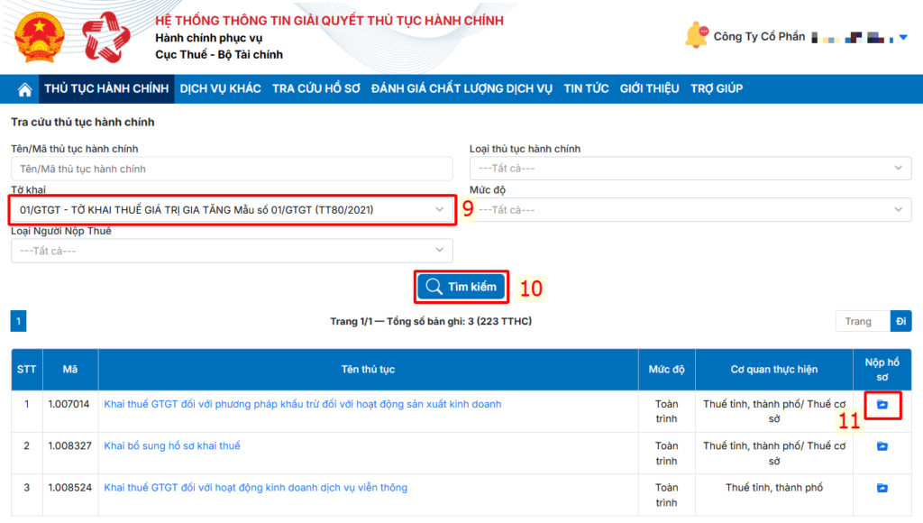 Tại Cột nộp hồ sơ, chọn biểu tượng thư mục tải tờ khai.